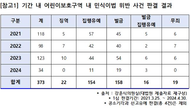 민식이법 시행 이후인 2021년 3월 25일부터 2024년 4월 30일까지 1심 판결 373건을 분석한 결과, 징역형 22건(5.9%), 집행유예 154건(41.2%), 벌금형 158건(42.4%), 벌금형 집행유예 17건(4.6%), 무죄 19건(5.1%)인 것으로 나타났다. 공소기각과 선고유예는 각 1건, 3건이었다.