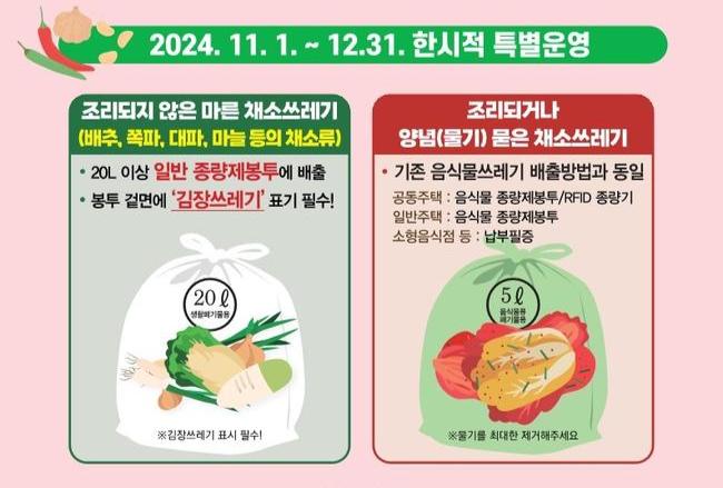 `김장쓰레기`는 음식물쓰레기 종량제봉투에 담아 배출하는 것이 원칙이지만, 11∼12월 김장철에는 배추 겉껍질 등 김장쓰레기가 대량 발생할 것으로 예상됨에 따라 구는 한시적으로 일반쓰레기 종량제봉투에 넣어 배출할 수 있도록 허용키로 했다.