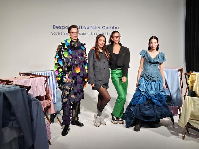 삼성전자가 지난 14일(현지 시간) 독일 베를린에서 유럽 전역에서 모인 인플루언서와 미디어를 대상으로 `비스포크 AI 콤보`의 시간 절약 장점 소개를 하고 있다. 대용량 양말, 수건 등으로 만든 옷으로 `패션쇼`를 하는 모습
