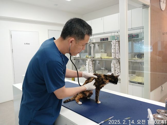협약 동물병원에서 중성화수술 전 길고양이 몸 상태를 살펴보고 있다.