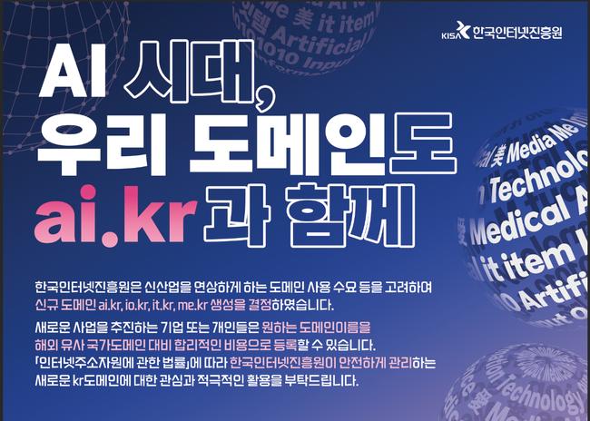 과학기술정보통신부(장관 유상임, 이하 과기정통부)는 5일부터 신규 3단계 kr 인터넷 주소(도메인) ‘ai.kr’, ‘it.kr’, ‘io.kr’, ‘me.kr’의 일반 등록 접수를 시작한다고 밝혔다. 이는 22년 만에 새롭게 도입되는 kr 도메인으로, 인공지능(AI) 등 신기술과 신산업의 발전에 맞춰 인터넷 주소 수요를 반영하기 위한 조치다.