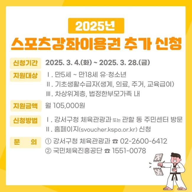서울 강서구(구청장 진교훈)는 저소득층 유·청소년의 체육활동을 돕기 위해 스포츠강좌 이용권 지원 대상자를 추가 모집한다고 밝혔다.