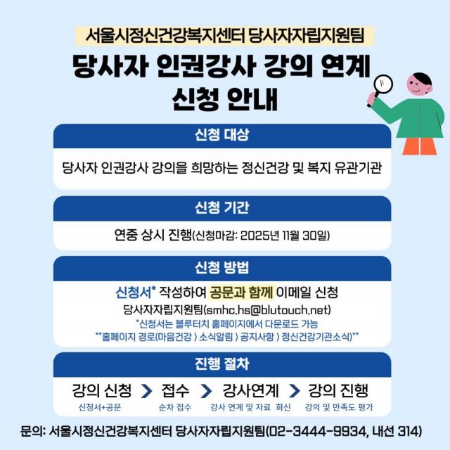 서울시정신건강복지센터(이하 서울센터)는 정신건강 분야의 당사자 권익 옹호 및 올바른 인권문화 조성을 위해 정신건강 관련 기관을 대상으로 당사자 인권강사 활동 연계 사업을 진행한다고 밝혔다.