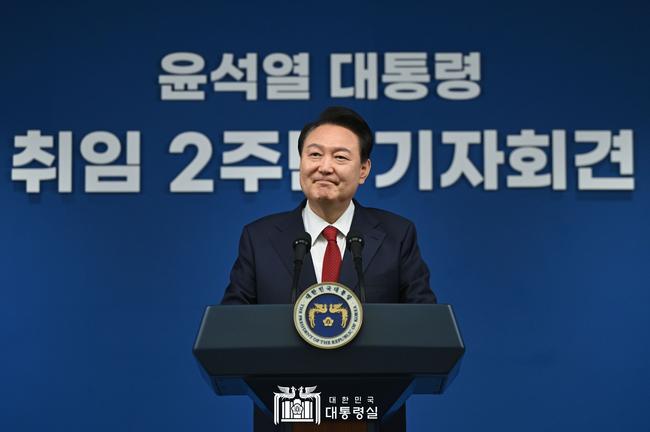 윤석열 대통령이 5월 9일 용산 대통령실에서 `취임 2주년 기자회견`을 하고 있다.
