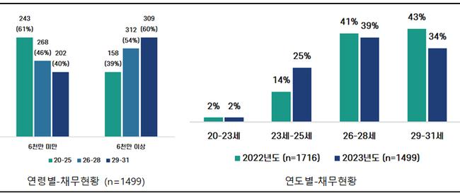 채무 총액별로 ▴6천만 원 미만에서는 20~25세(61%)가, ▴6천만 원 이상에는 29~31세(60%)가 가장 높아 연령이 높을수록 ‘채무 총액’이 높은 경향을 보였고, 23~25세의 개인회생 신청 비율이 `22년(14%) 대비 `23년(25%) 높아진 것으로 나타났다.