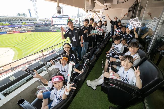KT가 19일 KT꿈품교실에 참여하는 난청 아동과 가족, 멘토 등 40여명을 초청해 수원 KT위즈파크에서 다양한 문화체험활동을 진행했다고 밝혔다. KT꿈품교실에 참여하는 난청 아동과 가족, 멘토 등 KT꿈품교실 구성원들이 단체 응원하는 모습.