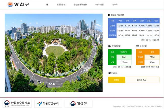 구는 풍수해 대비 구민들이 실시간으로 수방 정보를 확인할 수 있도록 ▲지역별 강우량 ▲지역 6개 빗물펌프장 펌프 가동현황 ▲신정교, 양화교 하천 수위 정보 ▲신월빗물저류배수시설 수위 정보 ▲팔당댐 방류량 ▲안양천 통제 현황 ▲양수기 작동 매뉴얼 등의 정보 제공으로 하천 침수사고에 대비할 수 있도록 했다.