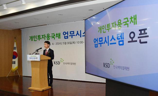 김윤상 기획재정부 차관이 5월 30일 오전 서울 영등포구 한국예탁결제원에서 열린 `개인투자용 국채 업무시스템 오픈 행사`에 참석, 축사를 하고 있다.