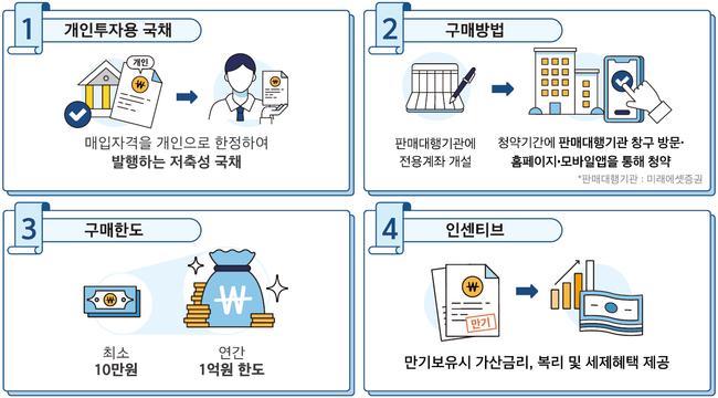 개인투자용 국채는 판매대행기관(미래에셋증권)의 영업점을 방문하거나 동 대행기관 웹사이트 또는 모바일앱을 통해서 전용계좌를 개설한 후 청약 기간에 구입할 수 있으며, 최소 10만원부터 1인당 연간 1억원 까지 구매 가능하다.