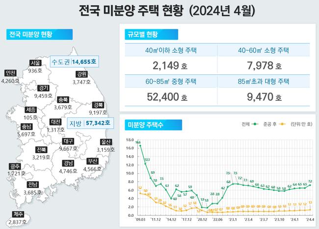 미분양 주택은 9개월 연속 증가하며 1만3천가구에 육박했다. ’24.4월말 기준 미분양주택은 총 71,997호로 전월 대비 10.8% 증가했으며, 준공 후 미분양은 12,968호로 전월 대비 6.3% 증가했다.