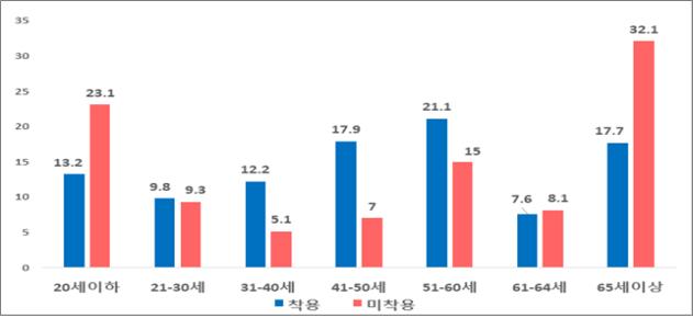 최근 5년간(2019~2023년) 가해운전자 연령대별 안전모 착용여부별 사고율