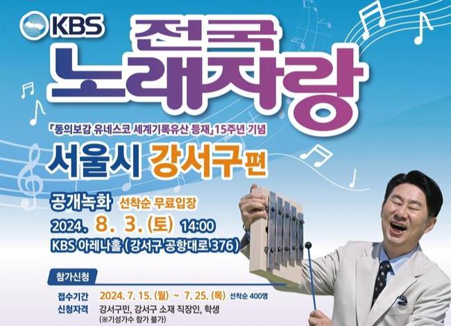 구는 오는 8월 3일(토) 오후 2시 KBS 아레나(화곡 6동 소재)에서 `KBS 전국노래자랑`을 개최한다고 밝혔다.