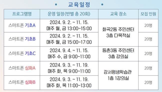 자세한 모집 일정과 회차별 교육내용은 강서구청 누리집-공지사항에서 확인할 수 있다.