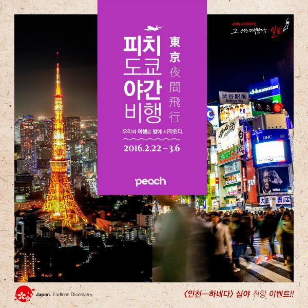 이번 이벤트는 ‘피치 도쿄 야간비행’이라는 주제로 심야에 즐길 수 있는 도쿄의 볼거리, 먹거리, 즐길거리에 대한 다양한 정보를 피치항공의 페이스북(www.facebook.com/Peach.Aviation.Korea)에서 댓글로 달면 추첨을 통하여 인천-하네다 왕복항공권을 제공한다. 1등 1명에게 커플항공권, 2등 2명에게는 각 1매씩을 제공하며 추가로 25명에게 스타벅스 기프트 카드 등을 제공한다.